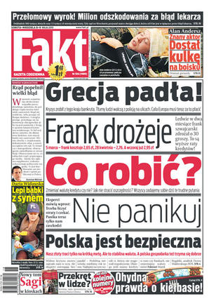Przełomowy wyrok – milion złotych odszkodowania za błąd lekarza; kryzys zrobił z Grecji bankruta, tłumy ludzi walczą z policją na ulicach; czy zmieniać walutę kredytu i jak nie stracić oszczędności; wstrząsająca relacja dziennikarzy ze Smoleńska; PIT Jarosława Kaczyńskiego; co jemy w kiełbasach; czy ostatni mecz Lechii z Piastem był ustawiony?