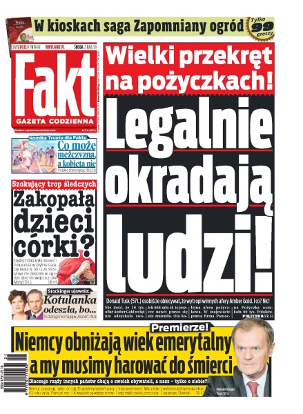 Wielki przekręt na pożyczkach, legalnie okradają ludzi – Donald Tusk osobiście obiecywał, że wytropi winnych afery Amber Gold; Niemcy obniżają wiek emerytalny, a my musimy harować do śmierci – dlaczego rządy innych państw dbają o swoich obywateli, a nasz - tylko o siebie; szokujący trop śledczych, czy zakopała dzieci córki – prokuratura w Gryfinie bada czy Beata K. ze Strzeszowa nie zakopała w ogrodzie dzieci nie swoje, lecz córki Marty; cała wieś chce zlinczować pedofila – zaciągnął 9-latkę do swojego mieszkania i brutalnie zgwałcił; czy Marcin Gortat przez nowy kontrakt nie zagra w kadrze – nasz jedynak w NBA raczej nie pomoże reprezentacji Polski grającej o awans do finałów ME; najdroższy rozwód wszech czasów, Rosjanin odda żonie 4,5 miliarda dolarów – oligarcha słono zapłaci za sex imprezy na swoich jachtach.