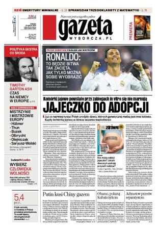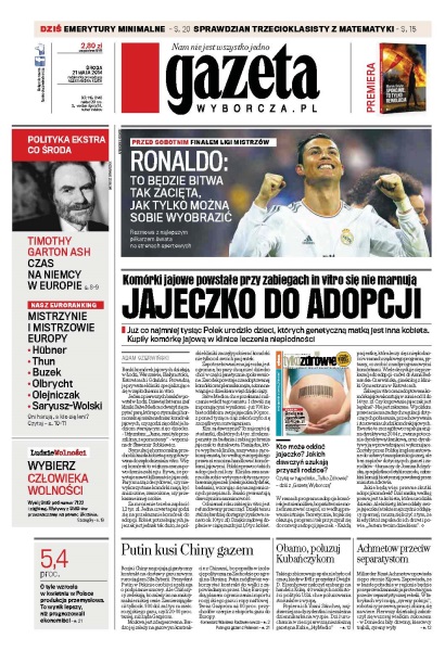 Jajeczko do adopcji – już co najmniej tysiąc Polek urodziło dzieci, których genetyczną matką jest inna kobieta, kupiły komórkę jajową w klinice leczenia niepłodności; Putin kusi Chiny gazem – Rosja i Chiny negocjują gigantyczny kontrakt na dostawy gazu nowym rurociągiem Siła Syberii, prezydent Putin w Pekinie osobiście zabiega o podpisanie umowy; Obamo, poluzuj Kubańczykom – takiego zbiorowego apelu nie było od czasu, kiedy w 1961 roku prezydent Dwight D. Eisenhower nałożył embargo na handel z Kubą – 40 ważnych osobistości polityki USA chce poluzowania stosunków z wyspą; Achmetow przeciw separatystom – miliarder Rinat Achmetow opowiada się po stronie Kijowa – zapowiada, że w każde południe w regionie będzie przeprowadzana akcja protestacyjna przeciw separatystycznej rebelii; klimat naczyń połączonych z Arktyką – w Arktyce największym wrogiem człowieka jest zimno.