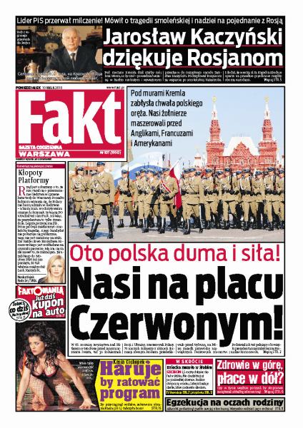 Pod murami Kremla zabłysła chwała polskiego oręża, nasi żołnierze maszerowali przed Anglikami, Francuzami i Amerykanami; Jarosław Kaczyński wystosował do rosyjskiego narodu bardzo osobiste i wyważone przesłanie; Kasia Cichopek nagim ciałem ratuje telewizyjne show; czy pomysł zwiększenia składek zdrowotnych wejdzie w życie; horror Polaków na Słowacji; Radosław Sikorski chce wydać nawet 760 tys. zł na krzesła dla urzędników.