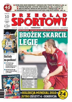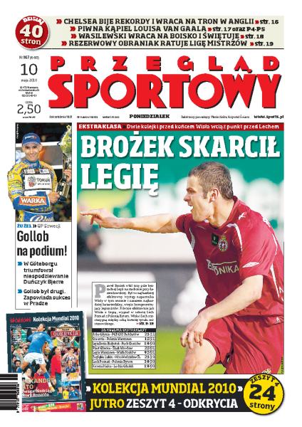 Paweł Brożek strzelił w meczu z Legią aż trzy bramki, dzięki czemu na dwie kolejki przed końcem sezonu Wisła wciąż prowadzi w tabeli; podczas żużlowego GP w Szwecji Tomasz Gollob zajął drugie miejsce; Chelsea Londyn zdobyła tytuł mistrza Anglii; szczegółowa analiza spotkań 28. kolejki piłkarskiej Ekstraklasy; rozmowa z Marcinem Wasilewskim; ósme miejsce Roberta Kubicy w GP Hiszpanii.
