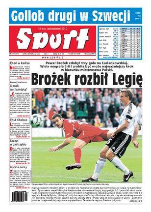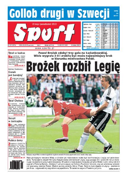 Wisła pokonała Legię 3:0, wszystkie gole w meczu zdobył Paweł Brożek; analiza pozostałych spotkań 28. kolejki piłkarskiej Ekstraklasy; kogo na najbliższe mecze towarzyskie powoła selekcjoner kadry Franciszek Smuda; Tomasz Gollob zajął drugie miejsce podczas turnieju rozgrywanego w Szwecji; Chelsea Londyn odniosła zwycięstwo w najlepszej lidze świata; Mariusz Pudzianowski po ciężkim pojedynku pokonał Japończyka Yusuke Kawaguchiego.