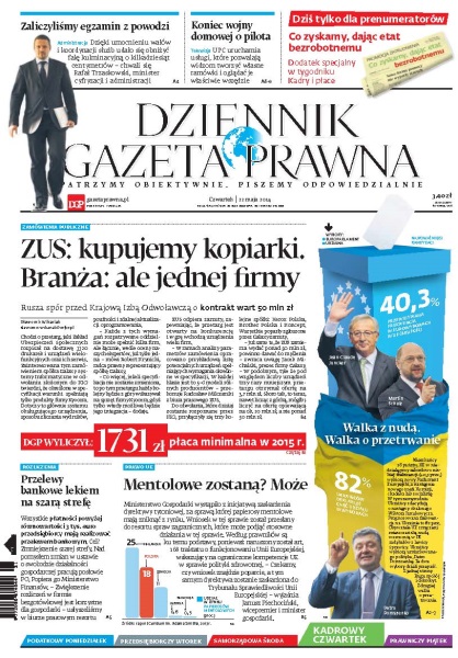 ZUS: kupujemy kopiarki, branża: ale jednej firmy – rusza spór przed Krajową Izbą Odwoławczą o kontrakt wart 50 mln zł; zaliczyliśmy egzamin z powodzi – dzięki umocnieniu wałów i koordynacji służb udało się obniżyć falę kulminacyjną o kilkadziesiąt centymetrów – chwali się Rafał Trzaskowski, minister cyfryzacji i administracji; koniec wojny domowej o pilota – UPC uruchamia usługi, które pozwalają widzom tworzyć własne ramówki i oglądać je właściwie wszędzie; przelewy bankowe lekiem na szarą strefę – wszystkie płatności powyżej równowartości 3 tys. euro przedsiębiorcy mają realizować przelewem bankowym; mentolowe być może zostaną – Ministerstwo Gospodarki wystąpiło z inicjatywą zaskarżenia dyrektywy tytoniowej, za sprawą której papierosy mentolowe mają zniknąć z rynku – wniosek w tej sprawie został przesłany do resortu spraw zagranicznych, które może podjąć stosowne działania w tej sprawie.
