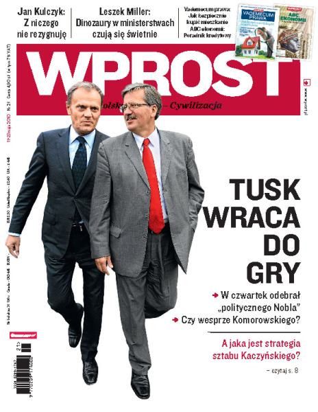 Czy Donald Tusk uratuje kampanię wyborczą Bronisława Komorowskiego i pomoże mu wygrać wybory prezydenckie; zamiast napadać na banki czy rabować tiry, polscy przestępcy wolą handlować narkotykami; jak wygląda strategia wyborcza sztabu Jarosława Kaczyńskiego; w ocenie Komisji Europejskiej pod względem innowacyjności, polskie uczelnie techniczne zajmują w Unii piąte miejsce od końca; jak wygląda codzienna służba oficerów BOR-u; najbardziej zagorzali oponenci ustawy o kinematografii przyznają, że dzięki niej polskie kino odżyło; rozmowa z Andrzejem Klesykiem, prezesem PZU; skąd UE weźmie obiecane 750 mld euro na pomoc zagrożonym kryzysem państwom.