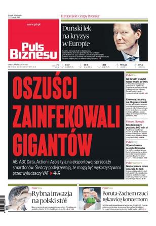Oszuści zainfekowali gigantów – AB, ABC Data, Action i Asbis tyją na eksportowej sprzedaży smartfonów, śledczy podejrzewają, że mogą być wykorzystywani przez wyłudzaczy VAT; duński lek na kryzys w Europie – recepta, którą ma Niels B. Christiansen, szef Danfossa, może nie spodobać się wielu polskim przedsiębiorcom, jego zdaniem, nowa Komisja Europejska powinna wyznaczyć ambitne cele klimatyczne, które przełożą się na nowe miejsca pracy w sektorze energetycznym; rybna inwazja na polski stół – nasze przetwórnie znów mają pełne ręce roboty, to zasługa norweskich rybaków – w I kwartale kupiliśmy ryby za 780 mln zł; Boruta-Zachem rzuci rękawicę koncernom – za 10 lat rynek biosurfaktantów będzie wart 30 mld USD, ta wizja pobudza wyobraźnię wiceprezesa Marcina Pawlikowskiego; esemesy z szansą na długowieczność – krótkie wiadomości tekstowe co godzinę przynoszą operatorom 15 mln USD przychodu i choć wchodzą im w paradę mobilne aplikacje, jeszcze długo pozostaną rentownym biznesem.