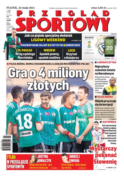 Gra o 4 miliony złotych – remis z Ruchem dzieli Legię od mistrzostwa Polski; najszybszy człowiek świata na Narodowym – rekordzista świata na 100 metrów Usain Bolt będzie gwiazdą V Memoriału Kamili Skolimowskiej; Wójcik przyznaje się do korupcji – oskarżony o udział w ustawianiu meczów były selekcjoner reprezentacji Polski Janusz Wójcik zaproponował dobrowolne poddanie się karze; wystarczy pokonać Słowenię – dziś reprezentacji Polski może zapewnić sobie awans do przyszłorocznych mistrzostw Europy; Bayern to ryzyko – Robert Lewandowski mówi, że Guardiola po finale Pucharu Niemiec powiedział mu: „Do zobaczenia wkrótce”.