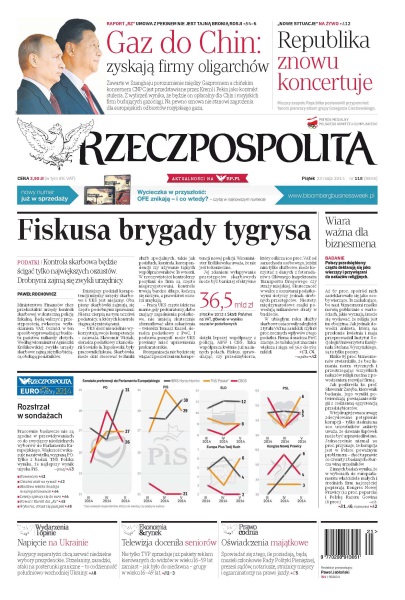 Fiskusa brygady tygrysa – kontrola skarbowa będzie ścigać tylko największych oszustów, drobnymi zajmą się zwykli urzędnicy; wiara ważna dla biznesmena – polscy przedsiębiorcy często deklarują się jako wierzący i przywiązani do nakazów religijnych; rozstrzał w sondażach – pracownie badawcze nie są zgodne w przewidywaniach co do zwycięzcy niedzielnych wyborów do Parlamentu Europejskiego; napięcie na Ukrainie – rosyjscy separatyści chcą zerwać niedzielne wybory prezydenckie – strzelaniny, zasadzki, ataki na posterunki graniczne – to codzienność południowo-wschodniej Ukrainy; telewizja doceniła seniorów – nie tylko TVP sprzedaje już pakiety reklam kierowanych do widzów w wieku 16–59 lat zamiast – jak było do niedawna – grupy w wieku 16–49 lat; oświadczenia majątkowe – spowiadać się z tego, ile posiadają, będą musieli członkowie Rady Polityki Pieniężnej, prezesi sądów, notariusze, strażnicy miejscy i egzaminatorzy na prawo jazdy.