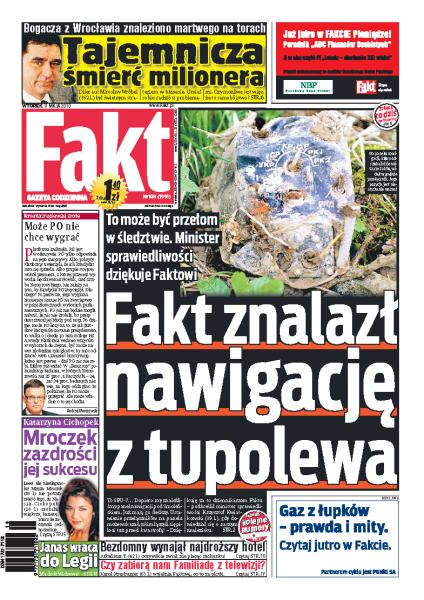 Fakt pomaga rozwiązać zagadkę związaną z katastrofą prezydenckiego samolotu pod Smoleńskiem; jak Andrzej Zoll ocenia rządy PiS; zagadkowa śmierć bogatego właściciela salonów samochodowych z Wrocławia; marszałek Bronisław Komorowski podkreśla swoje szlacheckie korzenie; jak Weronika Książkiewicz radzi sobie z wychowaniem synka; czy Wisła Kraków zostanie piłkarskim mistrzem Polski.