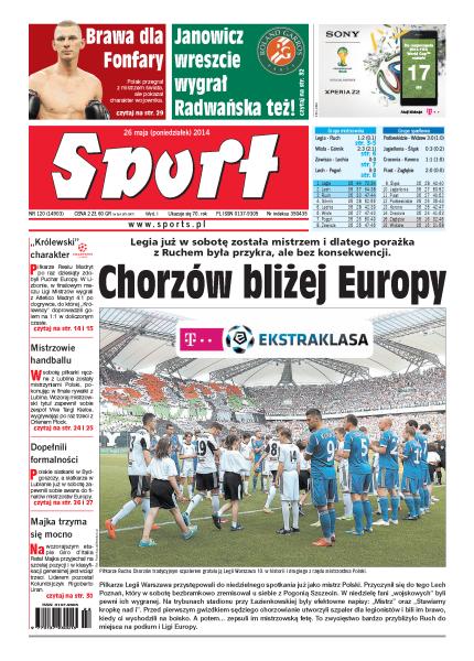 Legia już w sobotę została mistrzem i dlatego porażka z Ruchem była przykra, ale bez konsekwencji, Chorzów zaś jest bliżej Europy; piłkarze Realu Madryt po raz dziesiąty zdobyli Puchar Europy; brawa dla Fonfary: Polak przegrał z mistrzem świata, ale pokazał charakter wojownika; Roland Garros: Janowicz wreszcie wygrał, Radwańska też; w sobotę piłkarki ręczne z Lublina zostały mistrzyniami Polski; polskie siatkarki w Bydgoszczy, a siatkarze w Lublanie już w sobotę zapewnili sobie awans do finałów mistrzostw Europy; na wczorajszym etapie Giro d’Italia Rafał Majka przyjechał na szóstej pozycji i w klasyfikacji generalnej jest wciąż trzeci.
