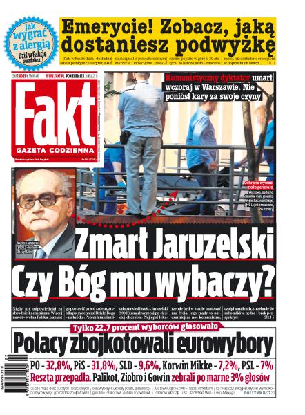 Zmarł Wojciech Jaruzelski; Polacy zbojkotowali eurowybory: głosowało tylko 22,7 procent wyborców; jaką podwyżkę dostaną emeryci; rodzina premiera kłóci się o pamiątki po słynnym dziadku; Joanna Moro płacze – przyniosła pecha Maserakowi; siedemnaście lat na planie, tysiące odcinków i miliony wiernych widzów – wszyscy ze smutkiem pożegnają już w czwartek Krystynę Lubicz, w której rolę wcielała się Agnieszka Kotulanka; zabiła męża i jeszcze chce prezentów; Jabłczyńska znalazła miłość; Legia zdobyła mistrzostwo Polski; Real trafił z piekła do nieba.