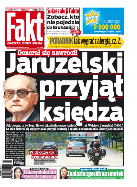 Jaruzelski przyjął księdza; Marta Kaczyńska na spacerze z mężem – a miał być rozwód; Justyna Kowalczyk znalazła sposób na smutek; sukces akcji „Faktu”: zobacz, kto nie pojedzie do Brukseli; poradnik: jak wygrać z alergią; eurolenie dostaną 250 tys. zł odprawy; tomograf zepsuty, pacjentka zmarła; polskie dziewczyny wolą cudzoziemców; myj owoce płynem do naczyń; pycha, ambicja i zazdrość zgubiły Moro; Legia świętowała mistrzostwo do rana; Janowicz wierzy w sukcesy.