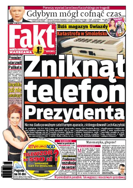 Co będzie testem nowego wizerunku wyborczego Jarosława Kaczyńskiego; na pokładzie prezydenckiego samolotu, który rozbił się pod Smoleńskiem były trzy telefony satelitarne, po katastrofie nie odnaleziono ani jednego; jak premier Donald Tusk ujarzmił Janusza Palikota; historia kobiety, której mąż porwał syna i wywiózł go do Włoch; groźny pies chciał rozszarpać twarz listonoszce; szokująca prawda o żółtym serze.