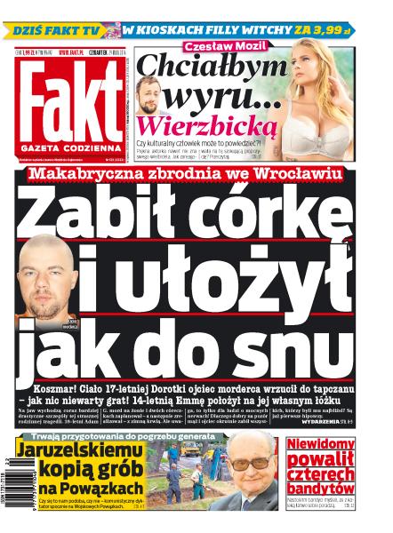 Zabił córkę i ułożył jak do snu; trwają przygotowania do pogrzebu gen. Jaruzelskiego; niewidomy powalił czterech bandytów; jak Wierzbicka zareagowała na propozycję Mozila; poseł Penkalski: bezkarny gbur z Wiejskiej; po tragedii w szpitalu w Katowicach; Paulina Sykut prezentuje kreację na Top Trendy; Rybus przeniesie się do Moskwy; Majka zaatakuje podium.