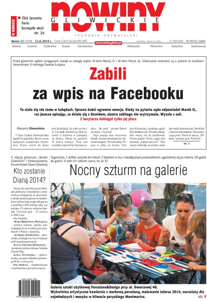 Zabili za wpis na Facebooku – to stało się rok temu w Łabędach, sprawa budzi ogromne emocje – kiedy na pytania sądu odpowiadał Marek O., raz jeszcze opisując, co działo się z Dawidem, siostra zabitego nie wytrzymała, wyszła z sali, z korytarza dobiegał tylko jej płacz; nocny szturm na galerie – tegoroczna, 7. ArtNoc przeszła do historii, z błyskiem w oku i nieodłącznym przewodnikiem uganialiśmy się po mieście; halowa przebieżka – ogromny żelbetowy kolos – tak na gorąco, po zwiedzaniu, gliwiczanie opisywali halę Gliwice, w sobotę, 7 czerwca, miasto po raz pierwszy zorganizowało dzień otwarty dla mieszkańców – budowę zobaczyło ponad 300 osób; Maciej perłą zabrzańskich zabytków – to będzie jedna z największych turystycznych atrakcji Zabrza, obok kopalni Guido i podziemnej sztolni, już w czerwcu zostanie otwarty kompleks turystyczny wokół szybu Maciej w Maciejowie.