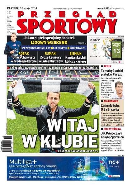 Łukasz Fabiański będzie grał w Swansea; Jerzy Janowicz z Jo-Wilfriedem Tsongą, a Agnieszka Radwańska z Ajlą Tomljanović zagrają dziś w III rundzie French Open; siatkówka: cudu nie było, O:3 z Brazylią; niesamowity J.P. Prince rzucił w pierwszym finale Turowa ze Stelmetem aż 30 punktów, a jego zespół wygrał 100:88; spółka zarządzająca ligowymi rozgrywkami wypłaci dodatkową premię trzem najlepszym klubom, zarobią: Legia, Lech oraz Ruch albo Górnik; rozmowa z Mariuszem Rumakiem, trenerem Lecha Poznań; napastnik Pogoni Marcin Robak jest o krok od zdobycia korony króla strzelców; w redakcji gościliśmy żużlowych sędziów, rozmawialiśmy między innymi o charakterze pracy arbitrów, roli komisarzy i wywieranej na nich presji; tylko dwie sekundy traci Rafał Majka do zajmującego trzecie miejsce w klasyfikacji generalnej Giro d’Italia Francuza Pierre’a Rollanda.