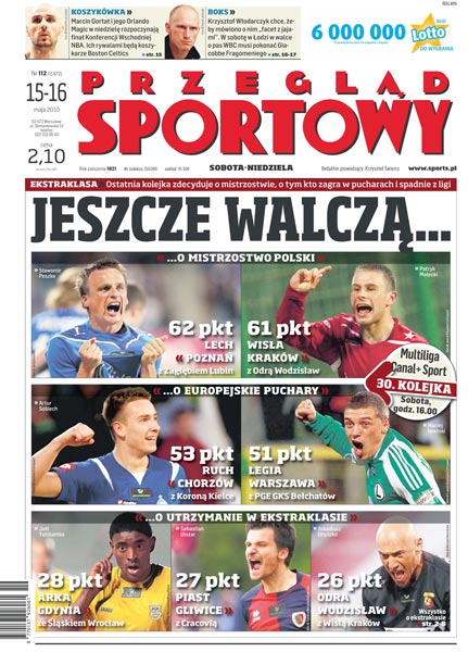 O mistrzostwo Polski walczą Lech Poznań i Wisła Kraków, o europejskie puchary Ruch Chorzów i Legia Warszawa, a o utrzymanie w Ekstraklasie Arka Gdynia, Piast Gliwice i Odra Wodzisław; w I lidze rewelacyjny beniaminek Sandecja Nowy Sącz podejmuje lidera Widzew Łódź; w Włoszech Inter Mediolan bliski zdobycia piątego z rzędu mistrzostwa kraju; we Francji pięć drużyn ma szanse na grę w pucharach, w tym te, w których grają Jeleń i Obraniak; Real jeszcze nie stracił szans na mistrzostwo Hiszpanii, ale wszystko przemawia za Barceloną; Bayern Monachium jest faworytem w meczu z Werderem Brema o Puchar Niemiec; w Anglii Chelsea będzie walczyła z Portsmouth o pierwszy w historii klubu dublet; Orlando Magic staną do walki o finał z Boston Celtics; cel Krzysztofa Włodarczyka w walce z Giacobbe Fragomenim: utrzymać mistrzowski pas w Polsce; w żużlowych ligach znów będzie gorąco; rozpoczyna się rywalizacja w finale PlusLigi kobiet: BKS Aluprof Bielsko-Biała kontra Bank BPS Muszynianka Fakro Muszyna; w Kielcach zespół Vive rozegra z MMTS Kwidzyn pierwsze mecze finału mistrzostw Polski w piłce ręcznej mężczyzn.
