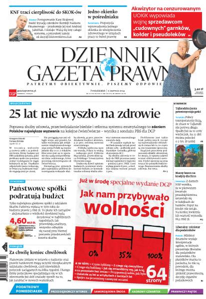 25 lat nie wyszło na zdrowie – poprawa służby zdrowia, przeciwdziałanie biedzie i reforma systemu emerytalnego to zdaniem Polaków największe wyzwania na najbliższe ćwierćwiecze; KNF traci cierpliwość do SKOK-ów; propozycja wprowadzenia jednego okienka do ubezpieczenia zdrowotnego w urzędach pracy to bubel prawny; UOKiK wypowiada wojnę sprzedawcom „cudownych” garnków, kołder i pseudoleków; państwowe spółki podratują budżet dywidendami; tajlandzka junta powstrzymuje gości; mamy boom na kredyty dla firm; minister finansów wydaje interpretacje ogólne, w których prezentuje liberalne dla podatników stanowisko.
