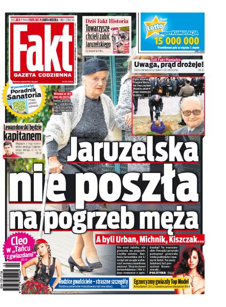 Jaruzelska nie poszła na pogrzeb męża; rodzice-gwałciciele – straszne szczegóły; egzorcyzmy gwiazdy Top Model; Lewandowski będzie kapitanem drużyny narodowej; uwaga, prąd drożeje; Cleo w „Tańcu z gwiazdami”; jak szprycują owoce chemią; czy gwiazdy show biznesu i polityki wdały się w rodziców; oszust brał pieniądze za rehabilitację seniorów, którzy już dawno zeszli z tego świata; Zamachowski zapłaci 18 tys. zł alimentów.