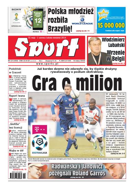 Już bardzo dawno nie zdarzyło się, by śląskie drużyny rywalizowały o podium ekstraklasy; siatkówka: polska młodzież rozbiła Brazylię; Radwańska i Janowicz pożegnali Roland Garros; nie Waldemar Fornalik, a (wciąż jeszcze) trener Dolcanu Ząbki, Robert Podoliński, będzie szkoleniowcem Cracovii; nie wiadomo, czy na ostatni sprawdzian przed eliminacjami mistrzostw Europy przyjadą Thiago Cionek, Maciej Wilusz i Łukasz Szukała; przykra wiadomość dla fanów piłkarskiej drużyny z Katowic: GKS nie otrzymał licencji na grę w I lidze w sezonie 2014/15; Rafał Majka był siódmy na 19. etapie Giro d’Italia - jeździe indywidualnej na czas - i w klasyfikacji generalnej spadł na szóstą lokatę.