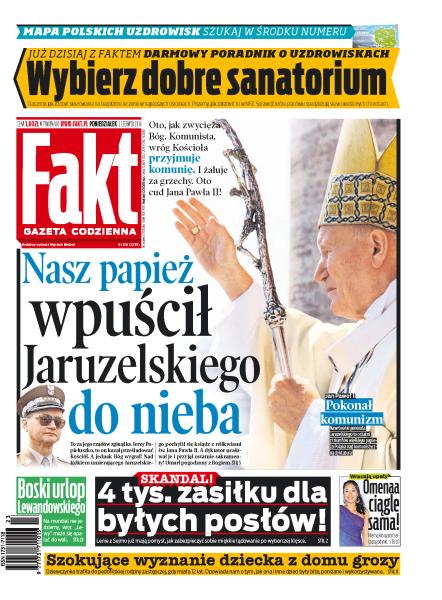 Nasz papież wpuścił Jaruzelskiego do nieba; poradnik: wybierz dobre sanatorium; 4 tys. zasiłku dla byłych posłów; Omenaa ciągle sama; boski urlop Lewandowskiego; szokujące wyznanie dziecka z domu grozy; kto jest mężczyzną u Wałęsów; samolot runął na domy; piękna maturzystka z Krakowa uratowała tonącą kobietę; jak gwiazdy dorabiają się na telewizji.