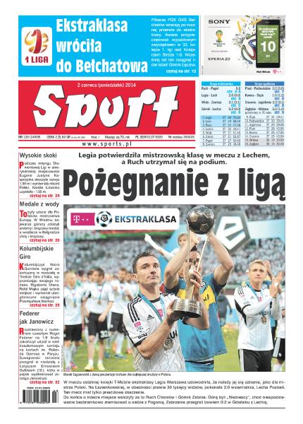 Legia potwierdziła mistrzowską klasę w spotkaniu z Lechem, a Ruch utrzymał się na podium; ekstraklasa wróciła do Bełchatowa; podczas mityngu Diamentowej Ligi Justyna Kasprzycka skoczyła wzwyż 1,99 i wyrównała rekord Polski; mistrzostwa Europy udane dla kajakarzy górskich i wioślarzy; Kolumbijczyk Nairo Quintana, chłopak z Andów, wygrał Giro d’Italia, najlepszy z Polaków, Rafał Majka, był szósty; rozstawiony z numerem czwartym Roger Federer na 1/8 finału zakończył udział w turnieju na kortach Rolanda Garrosa.