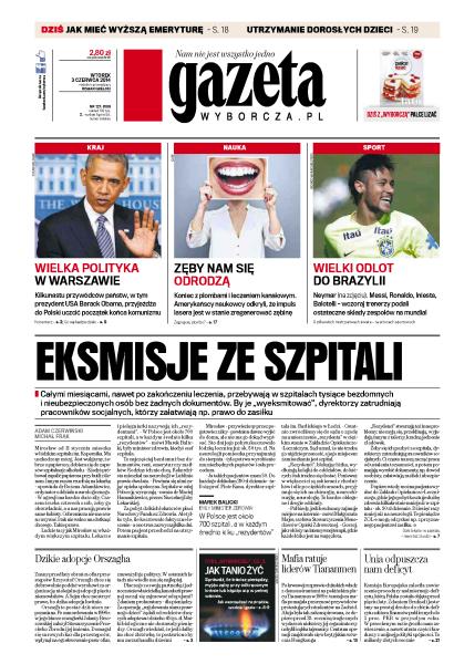 Całymi miesiącami, nawet po zakończeniu leczenia, przebywają w szpitalach tysiące bezdomnych i nieubezpieczonych osób bez żadnych dokumentów; wielka polityka w Warszawie: kilkunastu przywódców państw, w tym prezydent USA Barack Obama, przyjeżdża do Polski uczcić początek końca komunizmu; koniec z plombami i leczeniem kanałowym: amerykańscy naukowcy odkryli, że impuls lasera jest w stanie zregenerować zębinę; wczoraj trenerzy podali ostateczne składy zespołów na mundial; znany przed laty obrońca ofiar przestępstw Krzysztof Orszagh chce się dobrowolnie poddać wyrokowi za organizację nielegalnej adopcji pięciu niemowlaków; po krwawej rozprawie chińskich władz z demonstrantami na pekińskim placu Tiananmen w 1989 r. tamtejsza mafia pomagała przerzucać przywódców protestujących studentów na Zachód; Komisja Europejska zaleciła zawieszenie procedury nadmiernego deficytu, którą Polska została objęta przed pięciu laty.