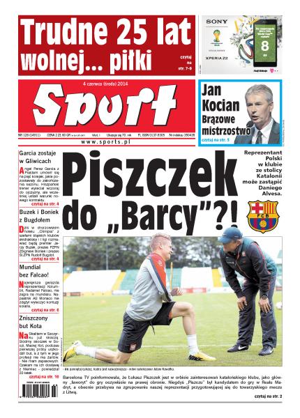Czy Piszczek trafi do Barcelony; Angel Perez Garcia z Piastem umówił się na pięć kolejek, jakie pozostawały do zakończenia sezonu, teraz ustalił warunki nowego kontraktu; dziś w chorzowskim hotelu „Olimpia” z szefami śląskich klubów ekstraklasy i I ligi rozmawiać będą premier Jerzy Buzek, prezes PZPN Zbigniew Boniek i prezes Śl.ZPN Rudolf Bugdoł; największa gwiazda reprezentacji Kolumbii, Radamel Falcao, nie zagra na mundialu – napastnik AS Monaco nie zdążył wyleczyć kontuzji kolana; na Skalitem w Szczyrku już skaczą; miejsce Ruchu na podium polskiej ekstraklasy to największe osiągnięcie w trenerskiej karierze Jana Kociana; piłka ręczna: bez Krzysztofa Lijewskiego i Bartłomieja Jaszki będą musieli poradzić sobie Polacy w dzisiejszym meczu z Hiszpanią; Łukasz Kubot i Robert Lindstedt nie wykorzystali szansy na awans do półfinału French Open.