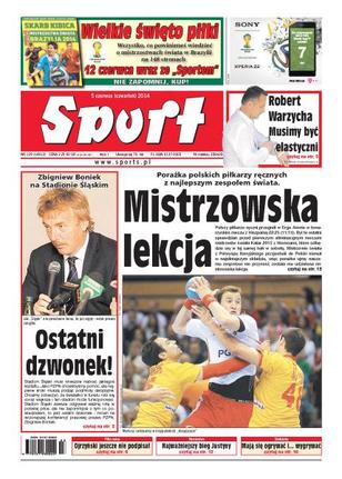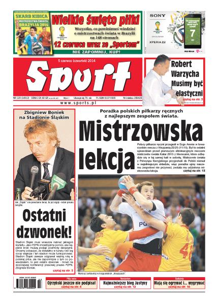 Porażka polskich piłkarzy ręcznych z najlepszym zespołem świata; jak „Śląski” nie powstanie teraz, to już nigdy – mówi prezes PZPN Zbigniew Boniek; trener zabrzan Robert Warzycha: Musimy być elastyczni; najważniejszy bieg Justyny Kowalczyk: o własne życie; rozmowa z Leszkiem Ojrzyńskim, trenerem Podbeskidzia; kadra młodzieżowa: próba generalna przed decydującym o wyjściu z grupy eliminacyjnej MME wrześniowym meczem z Grecją nie wypadła imponująco; Mundial: Miroslav Klose może przejść do historii MŚ jako najskuteczniejszy piłkarz i zawodnik z największą liczbą meczów.