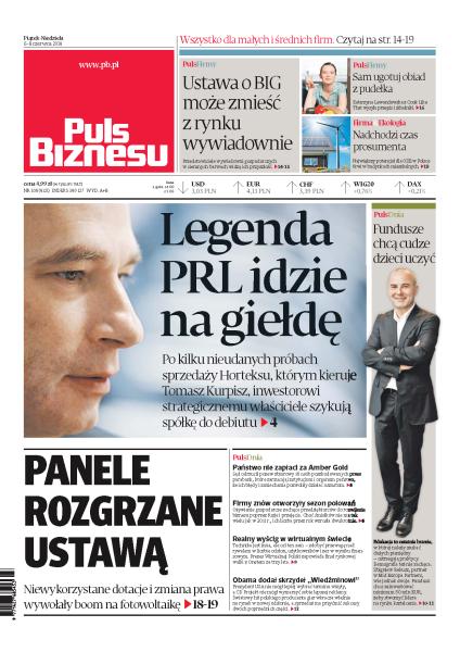 Legenda PRL idzie na giełdę: po kilku nieudanych próbach sprzedaży Horteksu właściciele szykują spółkę do debiutu; ustawa o BIG może zmieść z rynku wywiadownie; zaproponują danie, odmierzą składniki i wyślą w paczce do samodzielnego ugotowania — to pomysł na biznes właścicieli serwisu Cook Like That, na razie firma sonduje rynek tylko w Warszawie; nadchodzi czas prosumenta: największy potencjał dla OZE w Polsce tkwi w budynkach mieszkalnych; niewykorzystane dotacje i zmiana prawa wywołały boom na fotowoltaikę; sąd odrzucił pozew zbiorowy przeciw państwu poszkodowanych przez Amber Gold; ożywienie gospodarcze zachęca przedsiębiorców do rozwijania biznesu poprzez fuzje i przejęcia; prezes Wirtualnej Polski zapowiada finał rynkowej walki z Onetem za trzy lata; prezydent USA nie mógł lepiej wybrać terminu wizyty, a CD Projekt nie mógł wymarzyć sobie lepszej reklamy: gra „Wiedźmin” wkracza właśnie na rynek w nowej odsłonie, a sprzedaż ma przyćmić sukcesy dwóch poprzednich części; edukacja to ostatnia branża, w której należy szukać dużych pieniędzy — ostrzegają praktycy, ale fundusz Mid Europa Partners chce zainwestować minimum 50 mln EUR, żeby stworzyć lidera na rynku kształcenia.
