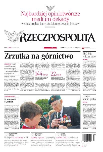 Zrzutka na górnictwo: każdy z nas sfinansuje ratowanie kopalń na przykład płacąc więcej za prąd; EBC bije w kurs euro obcinając swoją główną stopę procentową do rekordowo niskiego poziomu; przepisy, które wprowadziły odpłatność za drugi kierunek studiów, są niezgodne z konstytucją; 70. rocznica D-Day; frakcja PiS awansuje w Parlamencie Europejskim; łatwiej o pracę i podwyżkę; pozew zbiorowy poszkodowanych przez Amber Gold przeciwko państwu nie nadaje się do postępowania grupowego, orzekł w czwartek warszawski Sąd Okręgowy; Kongres Nowej Prawicy żył z datków zwolenników, sporo pieniędzy trafiało do firmy córki prezesa KNP; Bogdan Zdrojewski podsumowuje swoją kadencję na stanowisku ministra kultury.
