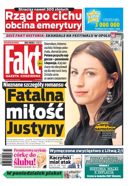 Nieznane szczegóły romansu Justyny Kowalczyk – dziennikarz, któremu zaufała i którego pokochała, złamał jej serce; premierowa szykuje córkę do ślubu – czyta książki na ten temat; Kaczyński miał atak – szef PiS miał kłopoty z oddychaniem; polscy piłkarze wygrali z reprezentacją Litwy, ale…
