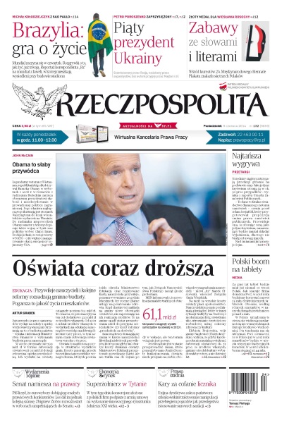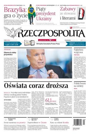 Przywileje nauczycieli i kolejne reformy rozsadzają gminne budżety – pogarsza to jakość życia mieszkańców; PiS liczyło, że eurowybory dobiją jego małych prawicowych konkurentów – los dał im jednak kolejną szansę; Palikot wraca do haseł liberalnych. SLD wciąż zerka na wyborcę socjalnego; piąty prezydent Ukrainy – szantażowany przez Rosję, naciskany przez separatystów, bez euforii przyjęty przez Majdan i Unię; rząd Irlandii zapowiada wyjaśnienie tajemnicy grobu setek małych dzieci z zakonnego domu opieki dla kobiet; Mundial zaczyna się w czwartek – dużo ważniejsze rozgrywki o to, jak żyć, już trwają.