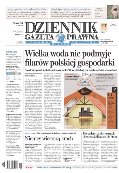 Powódź nie spowoduje obniżenia tempa wzrostu PKB, zwyżki inflacji oraz spadku produkcji przemysłowej; rośnie liczba wyłudzonych zasiłków chorobowych – najwięcej kontroli jest po donosach pracodawców; powodzianie, którzy otrzymają pomoc finansową z budżetu państwa lub budżetów gmin, nie zapłacą od tych środków podatku dochodowego; wrocławski sąd apelacyjny wyda dziś wyrok w sprawie Arki Gdynia; rosyjski monopolista gazowy nie wytrzymuje konkurencji rywali; niższe ceny i promocje mają przyciągnąć klientów, których wystraszył kryzys; bez gruntownej reformy postępowania sądowego nawet zwiększone nakłady na wymiar sprawiedliwości nie skrócą kolejki do sądu; jakie skutki podatkowe powoduje nieodpłatne przekazywanie towarów przez przedsiębiorcę.