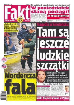 Minister zdrowia Ewa Kopacz potwierdziła, że miejsce tragedii w Smoleńsku ciągle jeszcze nie jest uprzątnięte; powódź dotarła już do województwa świętokrzyskiego; w Krakowie fala przy moście Dębnickim miała 10 metrów wysokości; w warszawskich Łazienkach zaprezentowano komitet honorowy Bronisława Komorowskiego; już w przyszłym tygodniu nie wyjadą na swoje trasy pociągi w całej Polsce; na warszawskich Powązkach pożegnano Macieja Kozłowskiego, który w poprzedni wtorek przegrał kilkuletnią walkę z ciężką chorobą; Colin Farrell drży o bezpieczeństwo ukochanej; Jeleń i Lewandowski prezentują w tym sezonie fantastyczną formę strzelecką; w szatni Lecha tuż po zakończeniu meczu zaczęło się świętowanie mistrzostwa Polski.
