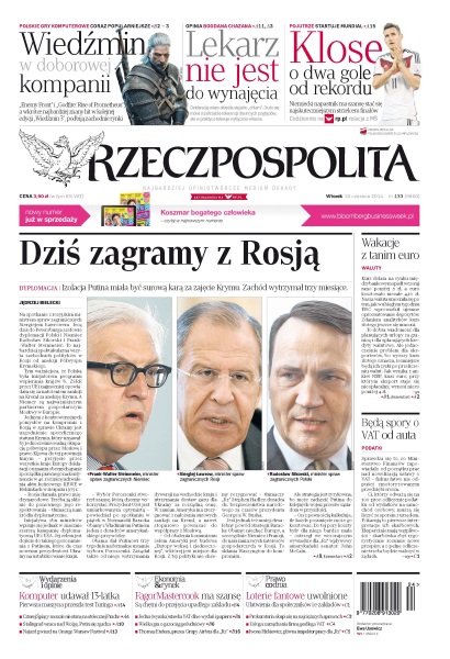 Izolacja Putina miała być surową karą za zajęcie Krymu – Zachód wytrzymał trzy miesiące; parlament na zamkniętym posiedzeniu ma dziś zdecydować o immunitecie Mariusza Kamińskiego; rośnie liczba Polaków wybierających czasową emigrację; PSL się martwi, że prace nad nowym wymiarem podatku będą się toczyć w czasie kampanii wyborczej; nadchodzące miesiące zdecydują o misji Poroszenki – dlatego Ameryka i Unia chcą zmusić Putina, aby dał szansę nowemu prezydentowi; Florence and the Machine zaśpiewa w sobotę na Orange Warsaw Festival; po raz pierwszy komputer przeszedł próbę Turinga i przekonał naukowców, że jest 13-letnim chłopcem; Miroslav Klose ma szansę stać się najskuteczniejszym strzelcem finałów.