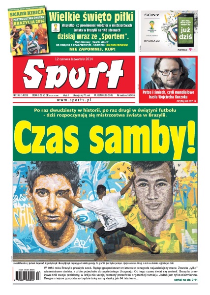Po raz dwudziesty w historii, po raz drugi w świątyni futbolu – dziś rozpoczynają się mistrzostwa świata w Brazylii; napięta atmosfera w Brazylii wokół mundialu sprawiła, że na ceremonii otwarcia nie będzie żadnych przemówień, a gala potrwa 25 minut; wielu obserwatorów zauważa, że 12 stadionów to przesada, że wystarczyłoby osiem obiektów – znać o sobie dały ambicje lokalnych baronów – mówi znawca latynoamerykańskiego futbolu; mam nadzieję, że limit pecha w tym roku już wyczerpałem i na trasach odcinków specjalnych nie będę trafiał na kamienie – powiedział Robert Kubica; Paweł Słomiński, autor sukcesów m.in. Otylii Jędrzejczak, uważa, że nie najlepsza kondycja polskiego pływania jest wynikiem słabego szkolenia; sześć zwycięstw i tyle samo porażek – to dorobek polskich par w pierwszym dniu turnieju głównego mistrzostw świata do lat 23, rozgrywanego w Parku Słupna.