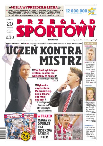 Kasa z praw telewizyjnych nakręca koniunkturę w ligowej piłce; znakomita oferta przedłużenia kontraktu dla Peszki; Zbigniew Długosz, były bramkarz Portowców ma nadzieję, że wreszcie uda się im wywalczyć Puchar Polski; wywiad z Jose Mourinho, trenerem Interu Mediolan; wywiad z Arturem Popką, prezesem profesjonalnej ligi piłki siatkowej; w finale Muszynianka prowadzi z Aluprofem Bielsko-Biała 2–1, dzisiaj czwarty mecz; Vive Targi mistrzem Polski – kielczanie wygrali trzeci mecz finału w Kwidzynie z MMTS 36:32; Marcin Gortat i spółka przegrali u siebie drugie spotkanie z Boston Celtics; Polsat Warsaw Open już bez Polek – Chinka Na Li za silna dla Katarzyny Piter.