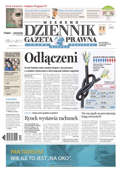 10 mln Polaków miało ostatnio kłopoty z korzystaniem z e-banków – użyteczność e-kont staje pod znakiem zapytania; Niemcy samodzielnie walczą z kryzysem, chcą po swojemu reformować strefę euro i wprowadzić kontrolę rynków finansowych; euro znów kosztowało wczoraj 4,20 zł, bo rynkiem wstrząsały plotki o wycofywaniu się inwestorów zagranicznych; na giełdzie liczy się nie rozwaga, lecz szybkość reakcji komputerów; Kijów nie godzi się na rosyjski model biznesowej współpracy; jak korzystnie rozliczyć z fiskusem leasing firmowego samochodu; oblężenie przeżywają zakłady opiekuńczo-lecznicze, gdzie na przyjęcie trzeba czekać nawet rok; prywatyzacja wydziałów ksiąg wieczystych skróciłaby okres oczekiwania na wpis.