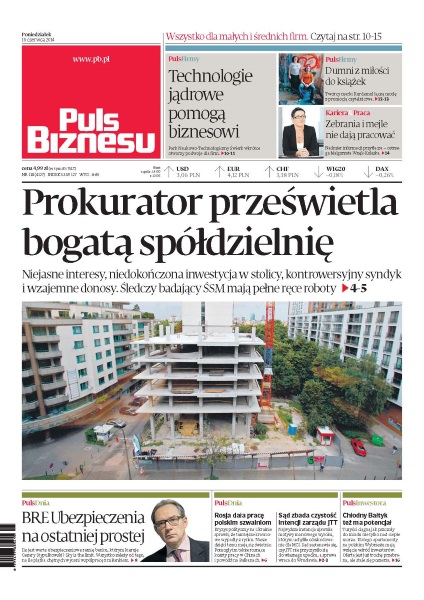 Park Naukowo-Technologiczny Świerk wkrótce otworzy podwoje dla firm; twórcy marki Kurdemol łączą modę z promocją czytelnictwa; niejasne interesy, niedokończona inwestycja w stolicy, kontrowersyjny syndyk i wzajemne donosy - śledczy badający ŚSM mają pełne ręce roboty; ile jest warte ubezpieczeniowe ramię banku, którym kieruje Cezary Stypułkowski; kryzys polityczny na Ukrainie sprawił, że tamtejsze krawcowe wypadły z rynku; najwyższa instancja ujawniła motywy marcowego wyroku, którym uchyliła odszkodowanie dla MCI; turyści ciągną jak pszczoły do miodu nie tylko nad ciepłe morza - dlatego apartamenty na polskim Wybrzeżu mają wzięcie wśród inwestorów.