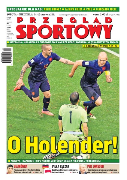 Holandia w fantastycznym stylu pokonała aktualnych mistrzów świata 5:1; Meksyk wygrał z Kamerunem 1:0 w meczu, w którym sędzia nie uznał trzech goli; polscy siatkarze wygrali 3:2 z Włochami w Lidze Światowej w Katowicach; piłka ręczna – dziś bitwa z Niemcami o mistrzostwa świata w Katarze.