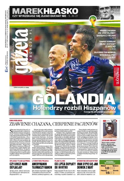 Kliniki płaczą po in vitro – jedna z dwóch łódzkich klinik leczenia niepłodności dostanie ponad 18 mln zł z rządowego programu in vitro; układ warszawski padł w sądzie; rządzący nie chcą dowodów na to, że w Polsce jest problem homofobii; tanieją warzywa, cukier, ryż i nabiał – latem będziemy mieć deflację; pasażerowie powoli przestają psioczyć na kolej; reprezentacja Holandii pokonała hiszpańskich mistrzów świata 5:1.