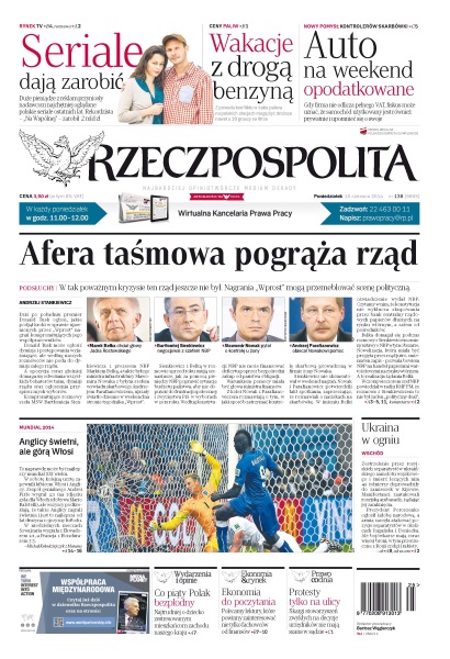 W tak poważnym kryzysie ten rząd jeszcze nie był - nagrania „Wprost” mogą przemeblować scenę polityczną; opozycja żąda dymisji rządu i odejścia m.in. prezesa Narodowego Banku Polskiego; rok po nagraniu rozmowy z prezesem NBP rząd spełnił większość jego żądań - odwołano ministra Rostowskiego i dobiegają końca prace nad nowelizacją ustawy o NBP; nie młodzi, lecz osoby starsze mają największe kłopoty na rynku pracy; Ukraińcy i Rosjanie oblegli swoje ambasady, a prezydent Poroszenko chce kolejnych sankcji wobec Rosji; dżihadyści zostali na chwilę powstrzymani, lecz sytuacja w Iraku daleka jest od stabilizacji; Warsaw Orange Festival to impreza all inclusive - oferuje gwiazdy i luksus; z upałem w Manaus lepiej poradzili sobie piłkarze Cesare Prandellego - sytuacja w grupie D stała się bardzo trudna dla Anglików.