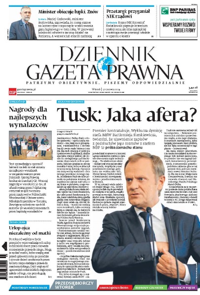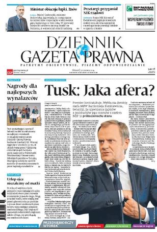 Maciej Grabowski, minister środowiska, zapowiada, ze rosną szanse na komercyjne rozpoczęcie wydobywania gazu łupkowego w tym roku; prezes NIK Krzysztof Kwiatkowski piętnuje kryterium niskiej ceny, ale izba najczęściej rozstrzyga swoje przetargi właśnie w oparciu o koszty; premier kontratakuje - wyklucza dymisje szefa MSW Bartłomieja Sienkiewicza, twierdzi, ze ujawnienie zapisów z podsłuchów jego rozmów z szefem NBP to próba zamachu stanu; test sprawdzający oporność bakterii na leki został uznany za najlepszy wynalazek w zorganizowanym przez Dziennik Gazetę Prawna konkursie Eureka; po roku od wejścia w życie przepisów wprowadzających urlop rodzicielski resort pracy rozważa rozszerzenie prawa do niego.