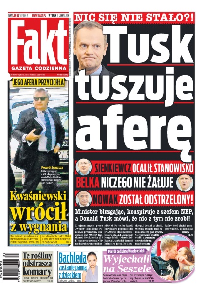 Zdaniem premiera politycy nie robili nic złego, tylko ten, kto ich nagrał; czy premier kłamał w sprawie Amber Gold; Aleksander Kwaśniewski wrócił do Polski, bo jego afera przycichła; jakie rośliny odstraszają komary; rodzice Piotra Staraka nie chcą mieć w rodzinie aktorki, która już raz złamała serce ich syna; Kuba Wesołowski zabrał żonę na wakacje; w pierwszym meczu na mundialu w Brazylii faworyzowana reprezentacja Rosji zmierzy się z nieobliczalną Koreą Południową; piłkarze Canarinhos mają z Meksykanami rachunki do wyrównania - Brazylijczycy sensacyjnie przegrali finał igrzysk olimpijskich w Londynie; niemiecki walec zmiażdżył Portugalię; po pół roku w śpiączce Michael Schumacher reaguje na dotyk, słyszy głos żony i jest świadomy.