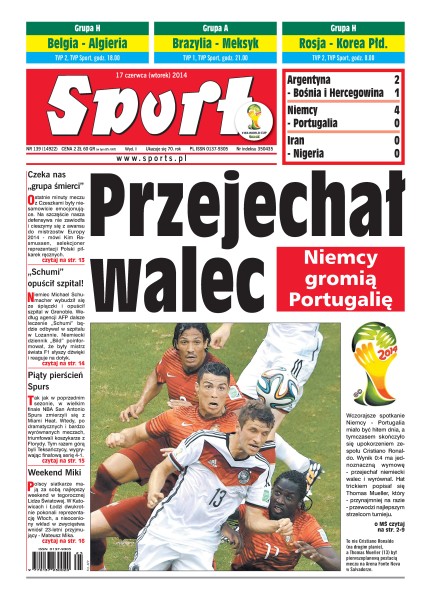 Przejechał walec – wczorajsze spotkanie Niemcy - Portugalia miało być hitem dnia, a tymczasem skończyło się upokorzeniem zespołu Cristiano Ronaldo – wynik 0:4 ma jednoznaczną wymowę, przejechał niemiecki walec i wyrównał; czeka nas „grupa śmierci” – ostatnie minuty meczu z Czeszkami były niesamowicie emocjonujące, na szczęście nasza defensywa nie zawiodła i cieszymy się z awansu do mistrzostw Europy 2014 w piłce ręcznej; „Schumi” opuścił szpital – Niemiec Michael Schumacher wybudził się ze śpiączki opuścił szpital w Grenoble; piąty pierścień Spurs – tak jak w poprzednim sezonie, w wielkim finale NBA San Antonio Spurs zmierzyli się z Miami Heat, mecz wygrali Teksańczycy wygrywając finałową serię 4-1; weekend Miki – polscy siatkarze mają za sobą najlepszy weekend w tegorocznej Lidze Światowej, w Katowicach i Łodzi dwukrotnie pokonali reprezentację Włoch, a nieoceniony wkład w zwycięstwa wniósł 23-letni przyjmujący, Mateusz Mika.