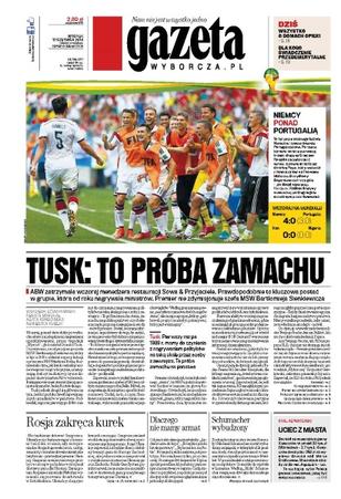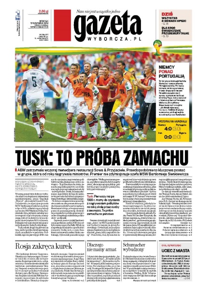 ABW zatrzymała wczoraj menedżera restauracji Sowa & Przyjaciele - prawdopodobnie to kluczowa postać w grupie, która od roku nagrywała ministrów; jak NBP może pomóc rządowi; dlaczego ojciec zatrzasnął dziecko w aucie pod elektrownią; jak wygląda życie na polskiej prowincji; powstałe trzy lata temu Islamskie Państwo w Iraku i Lewancie (IPIL) wyrosło nie tylko na najsilniejszą, ale i najbogatszą grupę światowego dżihadu; w niewielkiej nadmorskiej miejscowości we wschodnich Niemczech stanął największy na świecie stellarator – reaktor syntezy jądrowej; dla kogo miejsce w domu opieki; komu należą się świadczenia przedemerytalne; w meczu z Hiszpanią Arjen Robben nie tylko szybko biegał, ale i szybko myślał; Thomas Muller już jest liderem strzelców mundialu, Niemcy rozbili Portugalię 4:0, a pierwsza połowa była najlepszą, jaką ktokolwiek w brazylijskim turnieju ośmielił się zagrać.