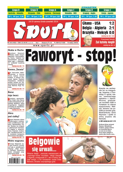Brazylia była bliska zwycięstwa, jednak genialny mecz rozegrał golkiper Meksyku, Guillermo Ochoa; Niemcy odnieśli wielkie zwycięstwo praktycznie bez udziału piłkarzy urodzonych w Polsce; Chile jeszcze nigdy nie pokonało Hiszpanii - jeśli dokona tego po raz pierwszy, odeśle mistrzów świata do domu; król strzelców Premier League wystąpi przeciwko Anglii - oba zespoły zagrają jutro w Sao Paulo o być albo nie być; w poniedziałek rusza Wimbledon - członek sztabu trenerskiego Agnieszki Radwańskiej i komentator Eurosportu mówi nam o zdrowiu, formie i ostatnich przygotowaniach krakowianki; sobotnia walka Mateusza Masternaka z Yourim Kalengą w Monte Carlo ma otworzyć triumfatorowi drogę na szczyt w wadze junior ciężkiej.
