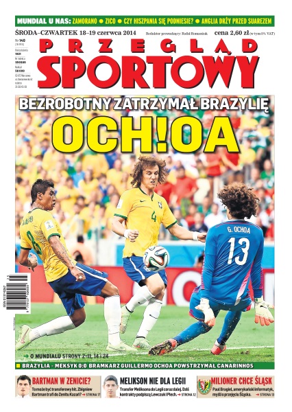Bezbarwny mecz gospodarzy - bramkarz Guillermo Ochoa bohaterem Meksykanów; rezerwowi zapewnili Belgom zwycięstwo; Oranje nigdy nie wygrali z Australią - jeśli dziś im się uda, będą w 1/8 finału; w czwartek naprzeciw siebie stanie duet najlepszych strzelców Premier League - w Anglii liverpoolczyków nazywają SAS, czyli Suarez and Sturridge; Wiktoria Azarenka wróciła na korty po ponad trzech miesiącach przerwy spowodowanej kontuzją stopy - dziś to cień mistrzyni z poprzedniego sezonu; w Ostrawie Amerykanin Justin Gatlin przebiegł 100 m w 9.86.