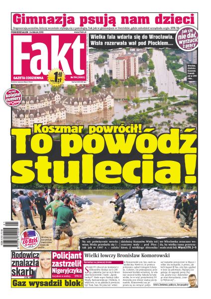 W sobotę we Wrocławiu trwała dramatyczna walka o Kozanów; Wisła zerwała wał w Świniarach, a do Torunia dotarła woda zrzucona z tamy we Włocławku; dwie najważniejsze osoby w kraju osobiście kontrolują sytuację na polskich rzekach; Jerzy Miller obiecuje powodzianom, że nikt nie zostanie bez pomocy; alkohol, papierosy, narkotyki, a nawet seks to codzienność szkół, gdzie uczą się nastolatki; na minutę przed katastrofą prezydenckiego tupolewa w Smoleńsku w kabinie pilotów była osoba spoza załogi; wybuch rozniósł dom w Siemianowicach Śląskich; Maryla Rodowicz odkryła nieznane dotąd piosenki Agnieszki Osieckiej; Tomasz Gollob nie dał w Czechach szans swoim rywalom; Tim Silvia pokazał, że Mariusz Pudzianowski nie ma jeszcze pojęcie o walkach MMA.