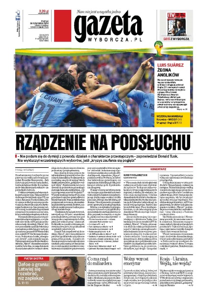 Janusz Piechociński powiedział premierowi, że jak kolejne nagrania wypłyną, kolejne osoby z rządu zostaną skompromitowane, to wtedy nie ma innego wyjścia, tylko szybkie wybory; Rosjanie znów koncentrują wojska przy granicy z Ukrainą – mówi sekretarz generalny NATO; z powodu niskiej inflacji emeryci mogą zapomnieć o dużych podwyżkach emerytur; czy każdy powinien biegać z planem treningowym; w dniu, kiedy król Juan Carlos oficjalnie podpisał swoją abdykację, w Brazylii reprezentacja opuściła futbolowy tron; Urugwaj z Luisem Suarezem okazał się inną drużyną niż bez niego - dwa gole superstrzelca dały zespołowi Oscara Tabareza zwycięstwo nad Anglią 2:1.